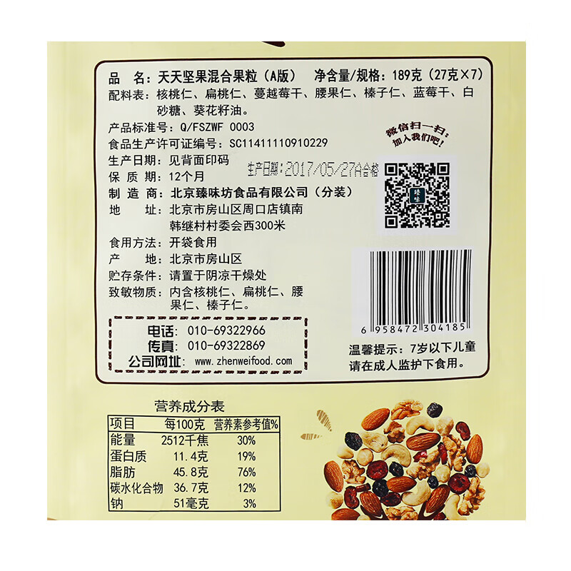 商品名称:臻味 天天坚果混合果仁 成人款 189g袋装 (27g*7袋)