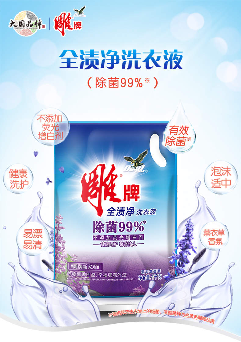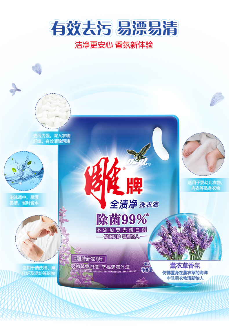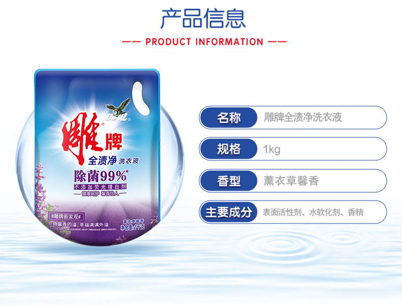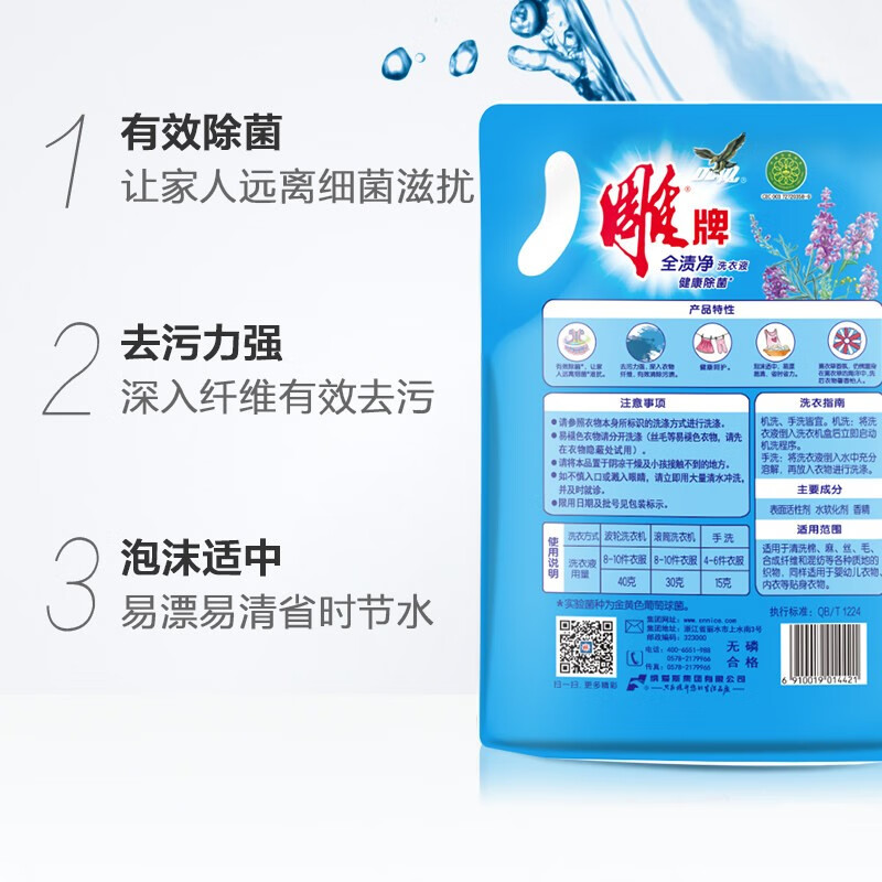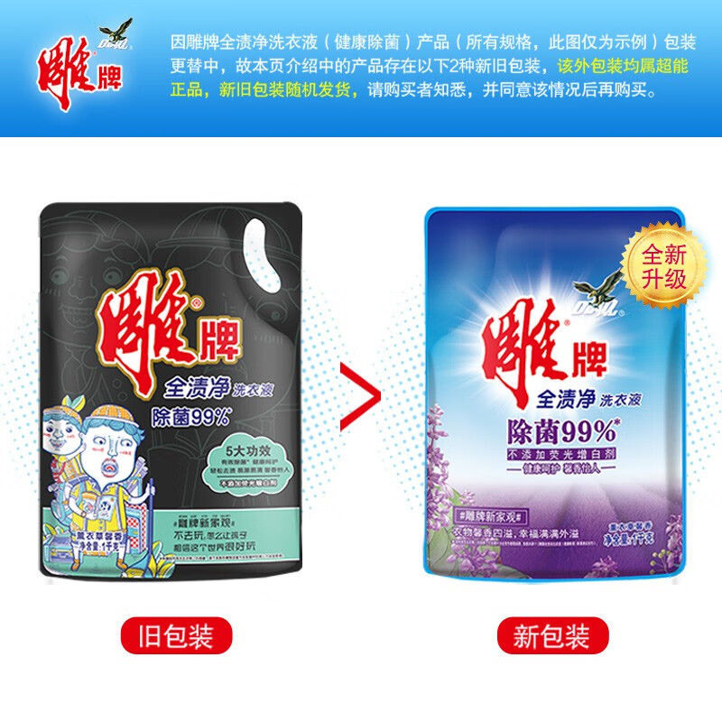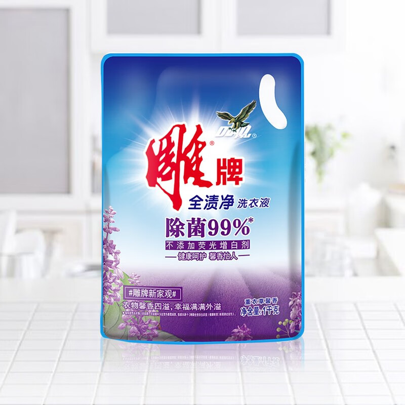 商品名称:雕牌全渍净洗衣液 健康除菌99%薰衣草香1kg*1 2袋起包邮