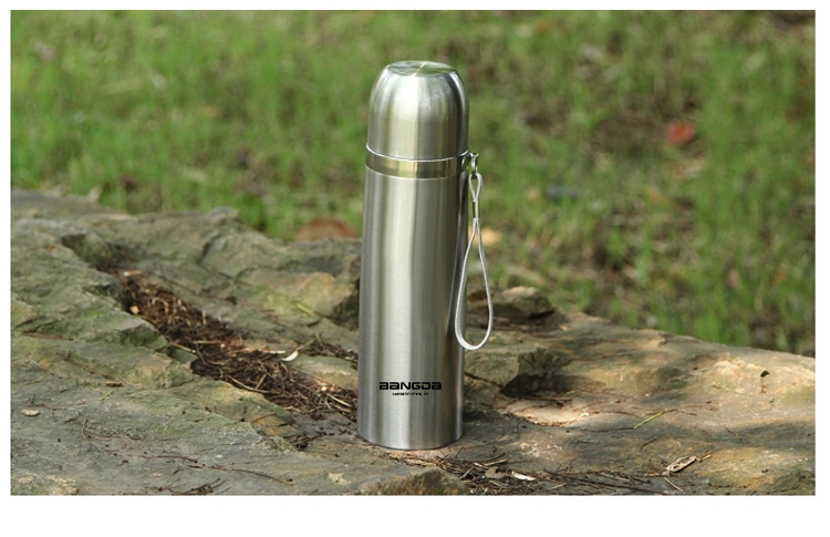 邦达保温杯男女 儿童双层不锈钢子弹头户外旅行带提绳水杯子粉色 500ml