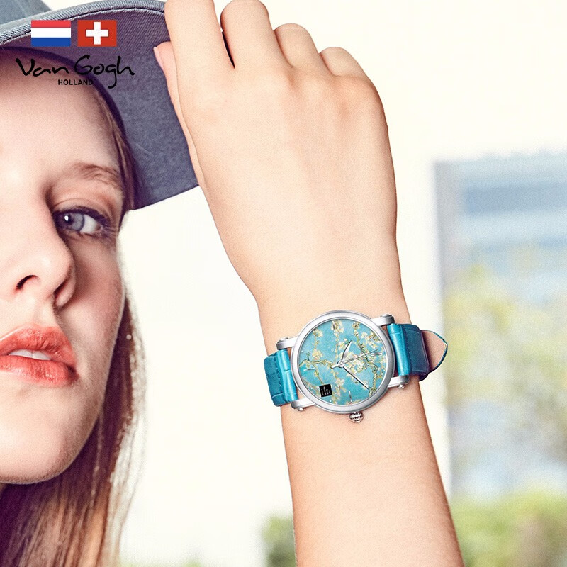 商品名称:梵高(VanGogh)瑞士女士石英手表 3D打印油画表面牛皮表带个性网红潮牌博物馆正版原装进口女表 盛开的杏树 Lady 09