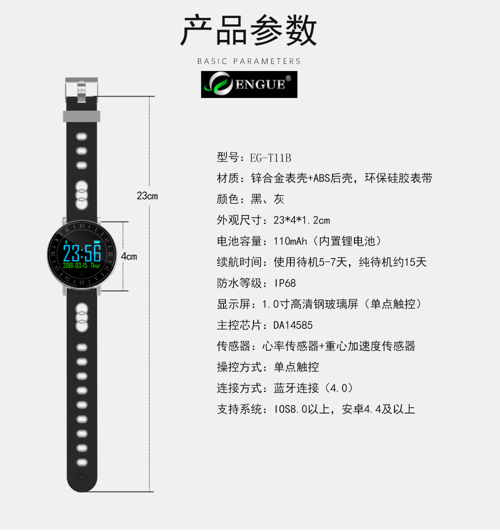商品名称:ENGUE恩谷手机蓝牙APP血压心率手环 拍照手环T11B 黑色