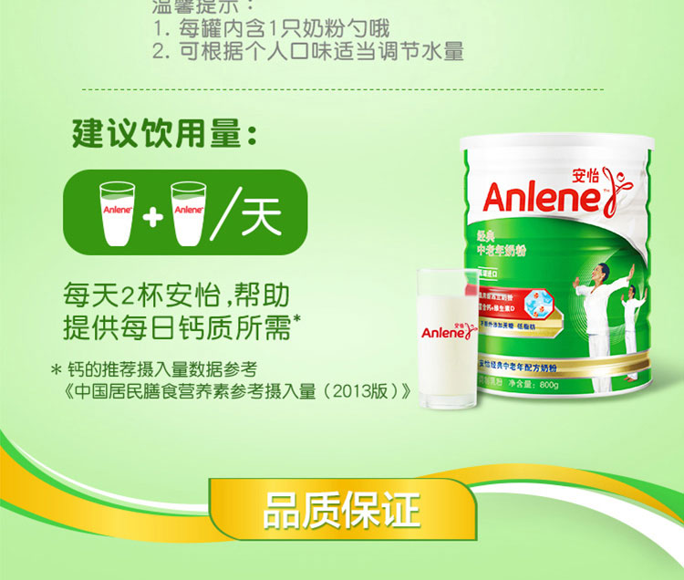 商品名称:安怡(Anlene)经典中老年配方奶粉 原罐进口 低脂肪无蔗糖成人中老年老人高钙奶粉 800g*2罐装
