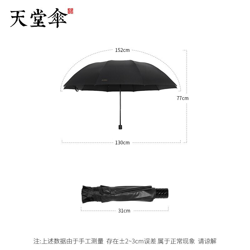 商品名称:天堂伞 晴雨伞三折10骨加大2-3人超大加固男女黑胶防晒伞 黑色 33212E黑胶