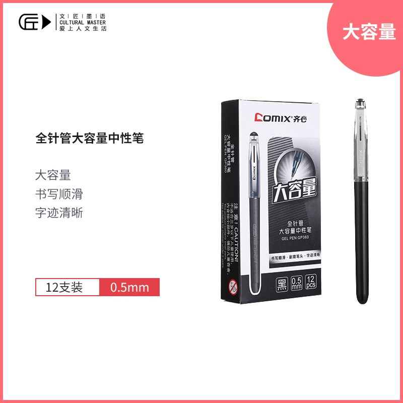 商品名称:齐心(COMIX) 高档商务办公学生考试专用0.5mm大容量全针管签字笔中性笔 拔帽式 GP360 商务黑12支/盒(5盒装)